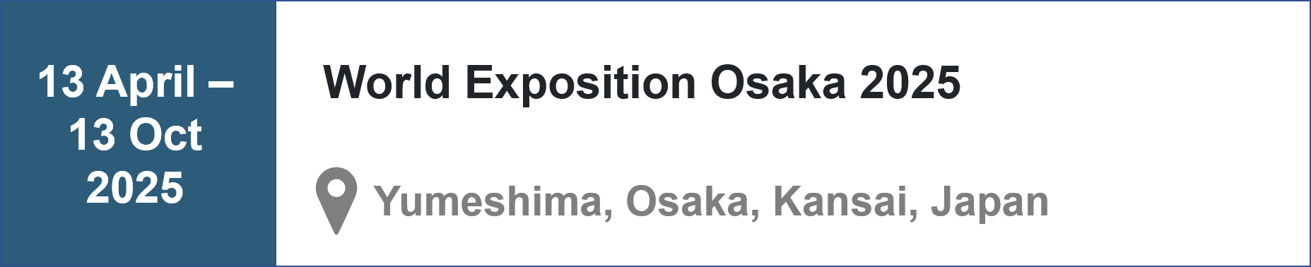 World Exposition Expo 2025 is an upcoming World Expo organised and sanctioned by the Bureau International des Expositions (BIE), which will be held in Osaka, Japan. The theme of Expo 2025 is “Designing Future Society for Our Lives” with subthemes of “Saving Lives”, “Empowering Lives” and “Connecting Lives.” Activities under this themes are aligned with the United Nation’s Sustainable Development Goals (SDGs) whose ultimate objective is to realise a diverse, inclusive and sustainable society backed with the pledge to ensure “no one will be left behind.” The Expo expects participants from local governments in the Kansai area, leading private-sector companies from Japan and overseas, and NGOs, NPOs, citizen’s groups, SMEs and individuals.